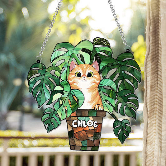Peeking Cat And Monstera - Personalized Cat Window Hanging Suncatcher Ornament