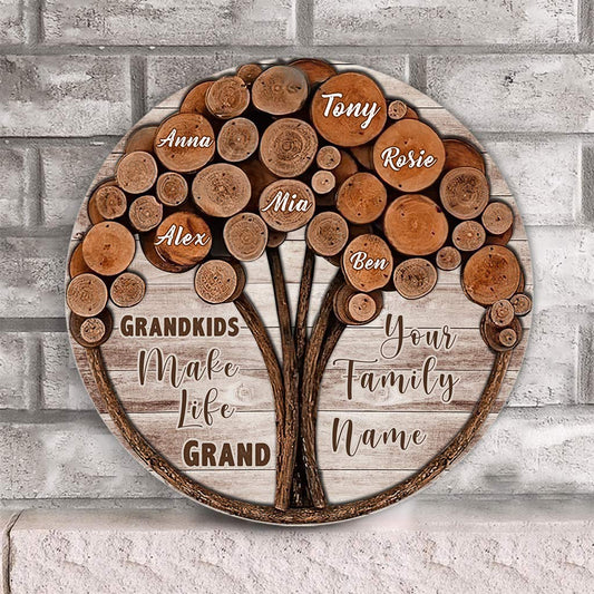 Grandkids Make Life Grand - Personalized Grandma Round Wood Sign